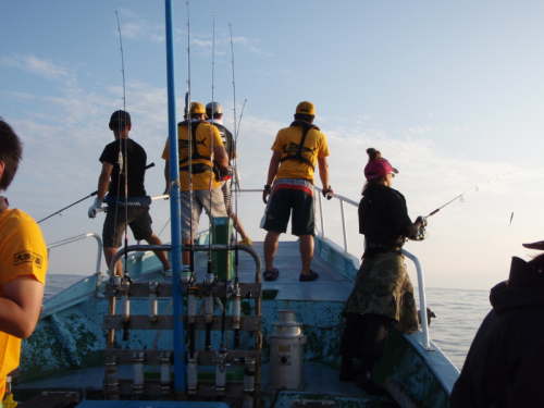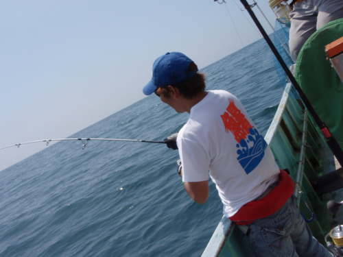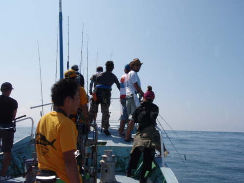 | いよいよ出船。 この日は台風の影響も有りうねりが強く3mの波 船に弱い僕はもうドキドキ。この時点で酔いそうな雰囲気に(汗) 酔い止め薬も2回飲んだけど一番の薬は 魚をHITさせる事 これが一番効きます(笑) |