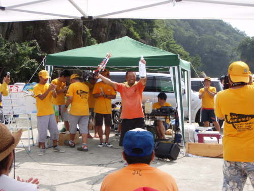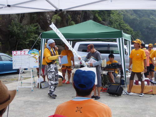 僕はと言うと朝一の魚の後、70cm台のシイラを1尾キャッチするもののその後は続かず 正直に言うと最初一尾で安心しちゃって(笑) タックルが重かったり、真夏の暑さに途中で疲れちゃって(汗) そうこうしているうちに 12:30 ストップフィッシング。 仁科港へ帰港。 各賞の発表等々あり閉会式に。 大会の詳細、大会の様子、大会結果、各賞等々・・・ 詳細は・・・ 大漁企画 BOSS 菅原さんが 菅原正志の『世田谷漁報』