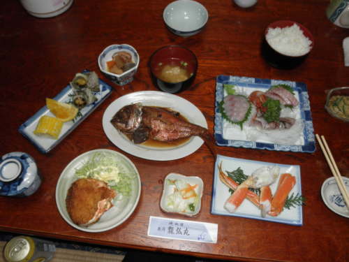 | 雨後の小一時間近くに有る河口でロッドを振ってみましたが・・・(笑) 帰り道、菅原さんらしき車が前を走っていたので後を追いかけるとやっぱり菅原さんでした。 あいさつし、宿に帰ると夕食が。 テーブルに並べたのは僕ですので並べ方には問題が有りますが いかがです? カニ有り、鯛の煮つけ有り。どの料理も皆美味しかったですよ〜 自前のハイボール500ccとアサヒスーパードライ500cc 2本飲んだら丁度良い感じ。 歯を磨い酔い止め薬を飲みて8時過ぎには寝てしまいました(爆) 0時ごろ目が覚めてしまって焦りましたが(笑) |