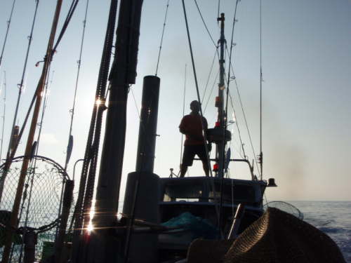 | ここから 浮遊物を探し、鳥山を探し 延々と魚を探して移動を繰り返す。 仁王立ちで操船し魚を見つける船長。 |
