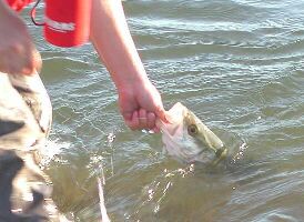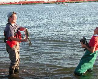 | 河口で釣を開始し2〜3時間後 皆さんの集中力が切れ出した頃 杉田編集長、菅原さんと談笑している最中の事 下流側で「HIT!」の声が それまで黙々とロッドを振り続けて居た 海梟のietanさんに シーバスがヒット 杉田さんがカメラを持って慌てて駆け寄る 私もそれに続く 走り寄る際にも魚が豪快にエラ洗いしている 外れるなよー 皆でそう祈る 無事ランディング成功! 歓声があがる やったなー おめでとう! バイブレーションが口にしっかりフッキングしていた サイズを測ると 62cm 銀ピカの綺麗なシーバスでした なんでも ルアー情報の頃から 杉田さんが新潟に取材に何度か来ておられるのですが、なかなか魚を出せなくて 今回もダメかなーと諦めかけた頃のHitだっただけにSLFCの皆さんも海梟の皆さんも 我が事の様にはしゃいでいました その後皆さんの目の色が変ったのは言うまでも有りませんよね 勿論私もですが(爆) Ietanさん おめでとう! 最高の笑顔ですよ |