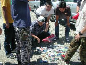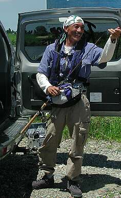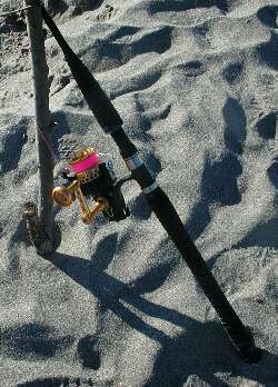 休憩中の菅原さんのサーフでのタックル 例の!?グリップへの巻物 そして ペンのリールが印象的 |